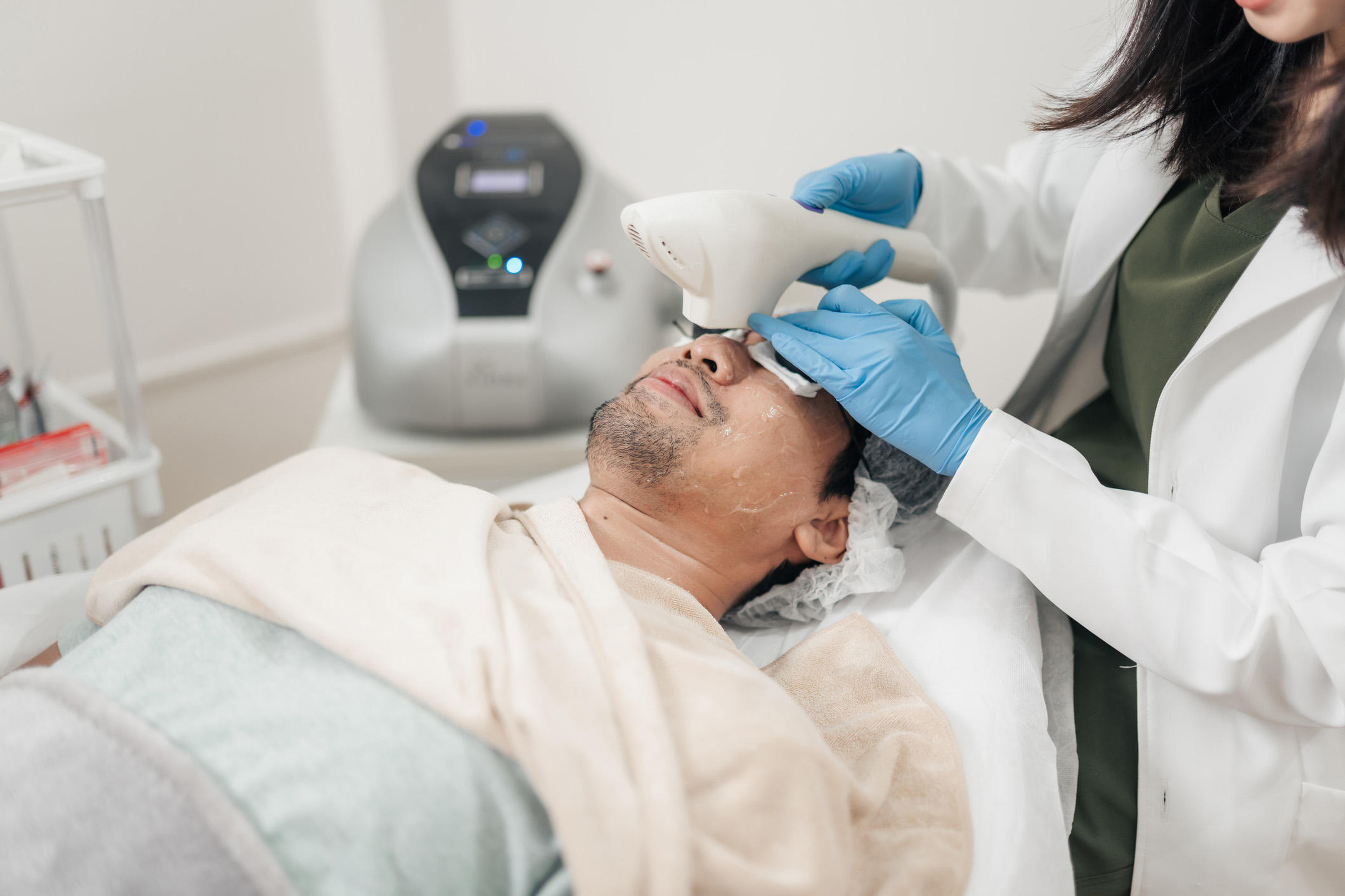 The treatment begins with IPL, which reduces the appearance of brown lesions through “photothermolysis,” a process that uses light to generate heat and destroy unwanted pigmentation. IPL’s precise wavelength causes the brown and red pigment to coagulate, which prompts the body to eliminate them.